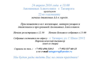 Новости Юбилей группы АА “Надежда” г. Таганрог – 24 апреля 2016 года - aadmin|Опубликовано 24.04.2016 24 апреля 2016 года в 13:00 Анонимные Алкоголики Таганрога празднуют 22-ю годовщину начала движения АА в городе